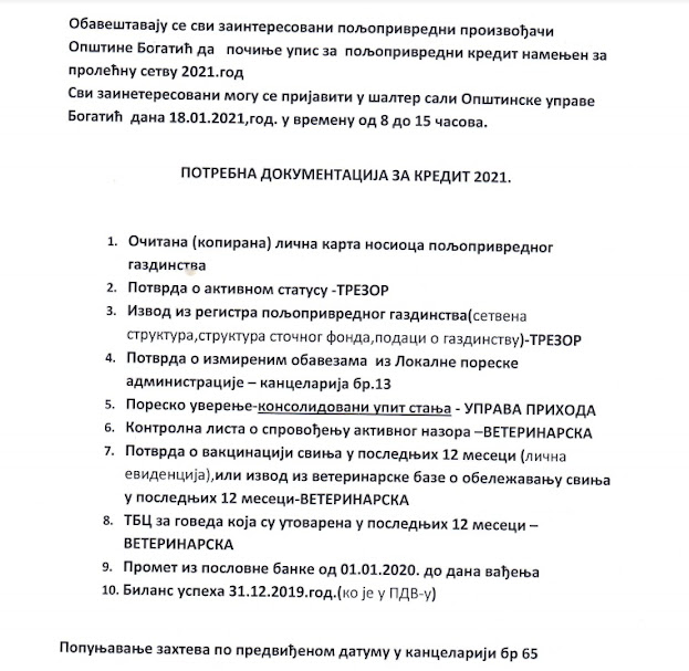 – Ovako više poljoprivrednika može da dobije kredit, uključujući i one sa manjim posedom. Nakon što se prijave za kredit poljoprivednici treba da prikupe dokumentaciju za podnošenje zahteva, kako je objavljeno na sajtu Opštine. Stručne službe lokalne samouprave će kao i ranijih godina pomoći poljoprivrednici da popune zahtev – dodao je Teodorović.